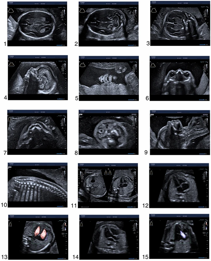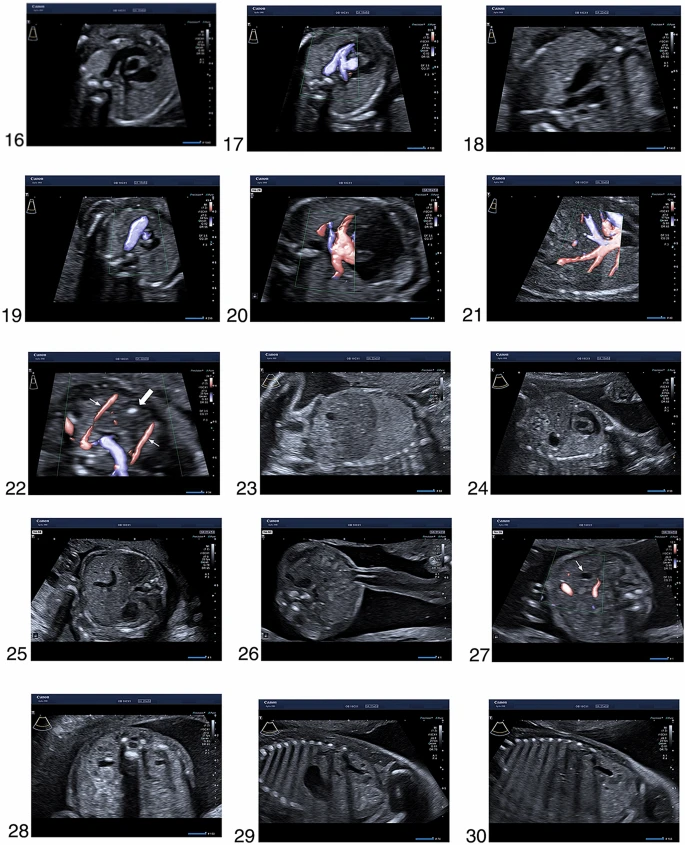 • Anatomia płodu - szczegółowa ocena organów wewnętrznych płodu, w tym mózgu, serca, nerek, żołądka, pęcherza moczowego oraz płuc. Ogląda się struktury takie jak móżdżek, sploty naczyniówkowe, czterokomorowy obraz serca, aortę, żołądek w odpowiedniej pozycji, obecność obu nerek oraz pęcherza moczowego.